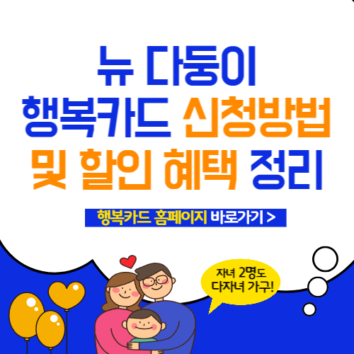 뉴 다둥이 행복카드는 2명 이상의 자녀를 가진 분들이라면 꼭 한번 확인해서 다양한 혜택을 받으세요. 출산율을 높이기 위해 정부에서 진행하는 사업인 만큼 점점 더 다양한 혜택이 생겨날 듯합니다. 홈페이지에서 더 다양한 정보 확인하셔서 많은 혜택 받으세요.