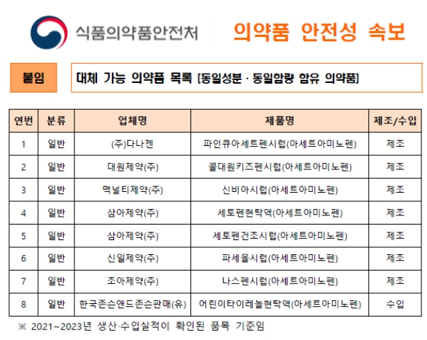 요즘같이 독감과 비염이 유행하는 시기에 아이들이 열이 나는 일이 많은데 해열제를 미리미리 구비해 놔야겠죠? 위에 대체 해열제 참고하셔서 미리 상비해 놓으시길 권장드립니다. 아이가 먹는 약에 다시는 이런 사태가 벌어지지 않게 빠른 조치가 이뤄지길 바랍니다.
